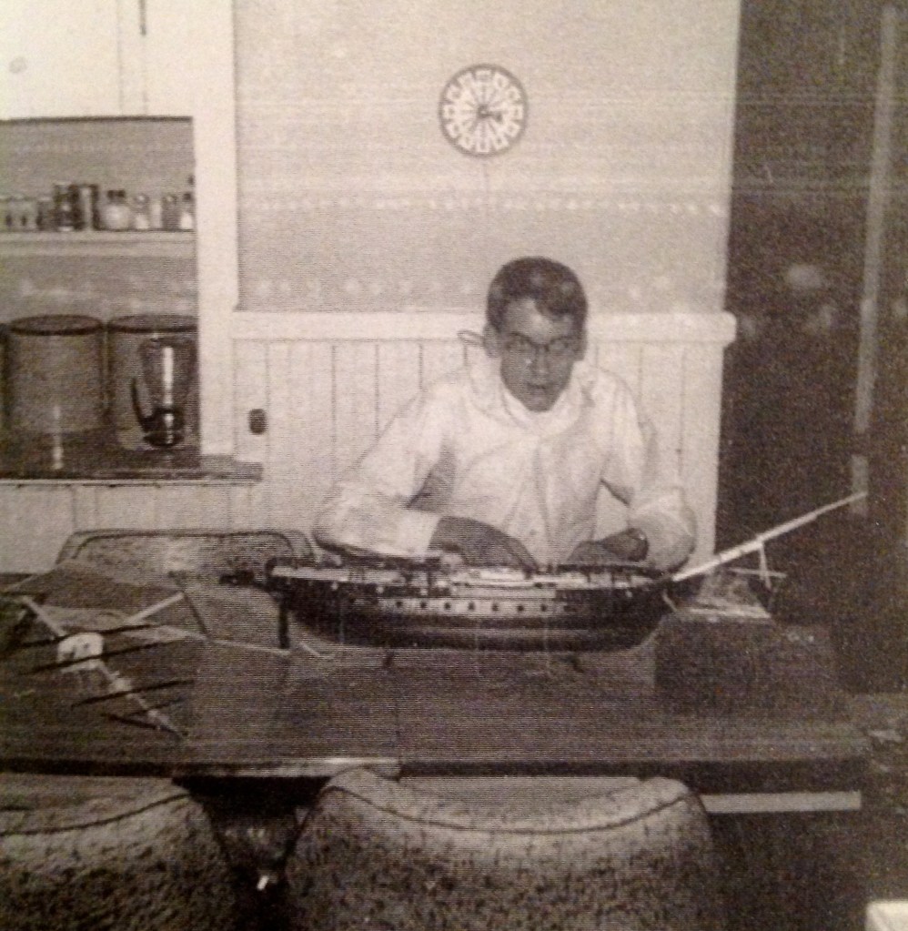 It was also the site of my ship building. I had built a couple of ship models in Salem, little affairs that you could hold in one hand. As I mentioned in a past post, one was the USS frigate Constitution. Now I had a brand new version of the same vessel, this time about three feet long, including the bowsprit; and over two feet high. It was fun and a challenge to build, what with the decks, masts and the intricacies of the rigging to put in place.
