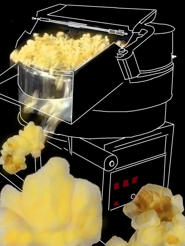 Hands down, the all time favorite weekly chore was popping popcorn. Popping day was usually on Friday, as a preparation for the weekend. You clocked in early and went down to the front of Cinema 2. There in a dedicated room to the left of the screen, the huge Cretor’s popping machine was housed. It was about eight or nine feet long, consisting mainly of a stainless steel bed upon which the popcorn was poured from the cooking kettle positioned at the head. It had a slight downward angle. Plastic bags were fitted out at the lower end and the popped corn was stuffed into them.