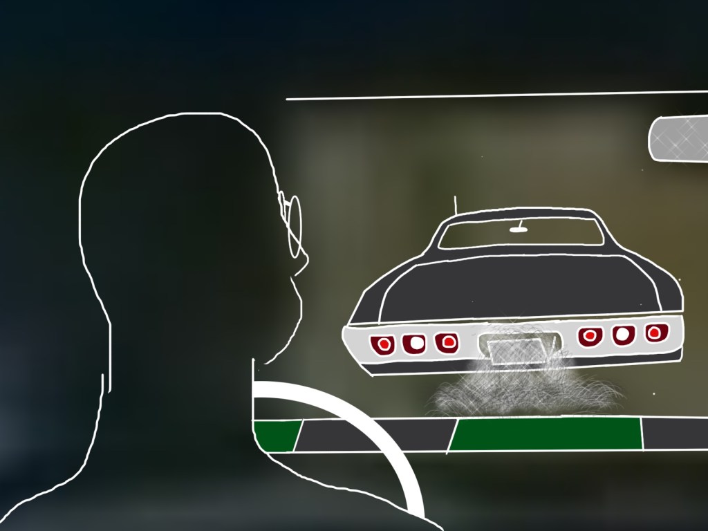 At the I-405 exchange, the vehicle took the ramp for I-405 southbound. So it was decided. I sped up – easy to do in a Roadrunner – took to the passing lane and drove up beside the doomed auto. I honked my horn and waved. It was a woman at the wheel, alone. She sped up. The fact of her sex made it worse. Should I try again and risk terrorizing her? This time, visions of discarded cigarette butts, glowing red.