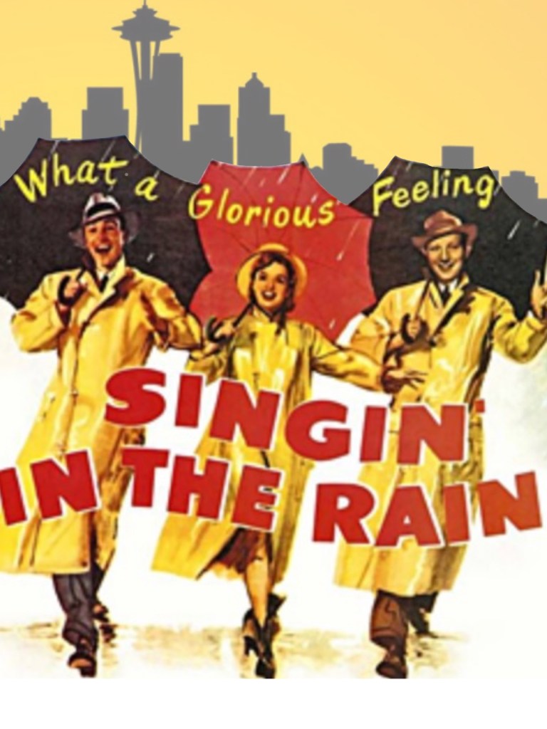 I can state truthfully that neither of us knew what we were in for when we took our seats at the Harvard Exit that night. Right from the opening credits through which Gene Kelly, Debbie Reynolds and Donald O’Connor sing and dance the title tune, all the way to the HAPPY ending, we were treated to a rollicking good time. It was exhilirating, and dare I say intoxicating, in the best sense – a joy and a delight to see Kelly dance (not only in his famous solo reprise of the title tune, but throughout), and jaw-dropping wonder at O’Connor’s solo turn that made us laugh. And sweet, winsome Debbie Reynolds won our hearts completely.