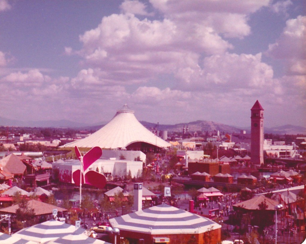 The next day we left the camper trailer set up on its site and took the Roadrunner into town unencumbered. The fair had been built right in the center of Spokane along the Spokane River, on land reclaimed from blighted industrial and railroad properties. One of the sights was a clock tower left standing when the rest of the Great Northern railroad station was taken down. We spent the day walking the grounds or in the skyrides, seeing the sights. One of the skyrides went over the river falls and underneath the Monroe Street bridge, the same street that was the bete noir of my childhood when my family lived in Spokane.