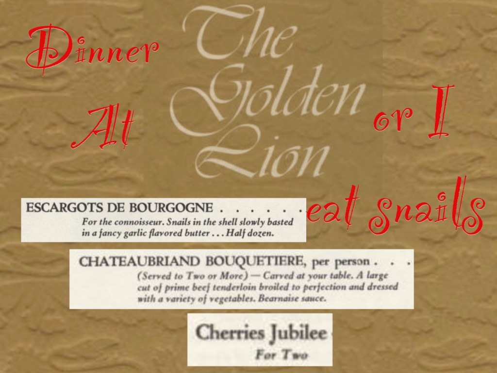 The Golden Lion was a high-toned eatery with decor and a wait staff decked out in a style reminiscent of the British Raj. (Turbans adorned those flaming the special dishes). It was a mite intimidating for one who didn’t know a chafing dish from a salad bowl. But our host put us at ease, and told us to order whatever we wanted.
