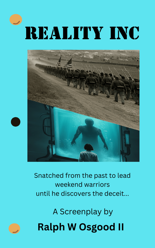 Here with the book cover for Running Out of Sky I continue to mimic the screenplay form of blue card stock paper secured by brads at top and bottom.